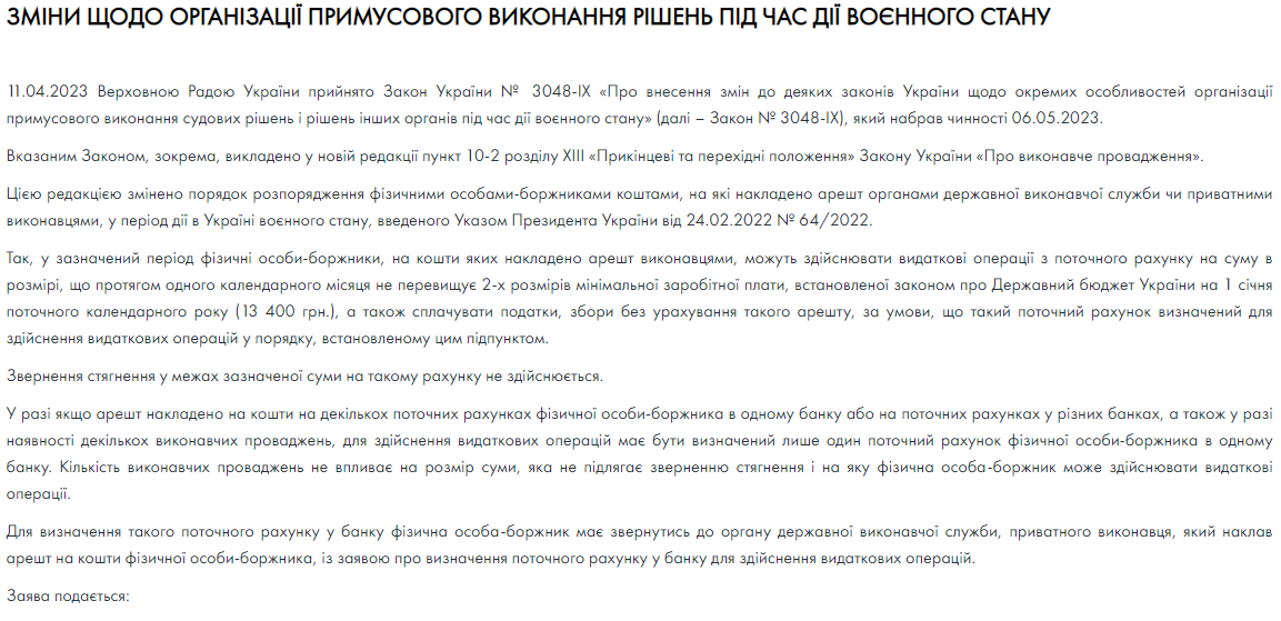 Але поки що законодавством визначено, що фізична особа може витрачати з арештованого органами Державної виконавчої служби чи приватними виконавцями поточного рахунку не більше 13 400 гривень на місяць.