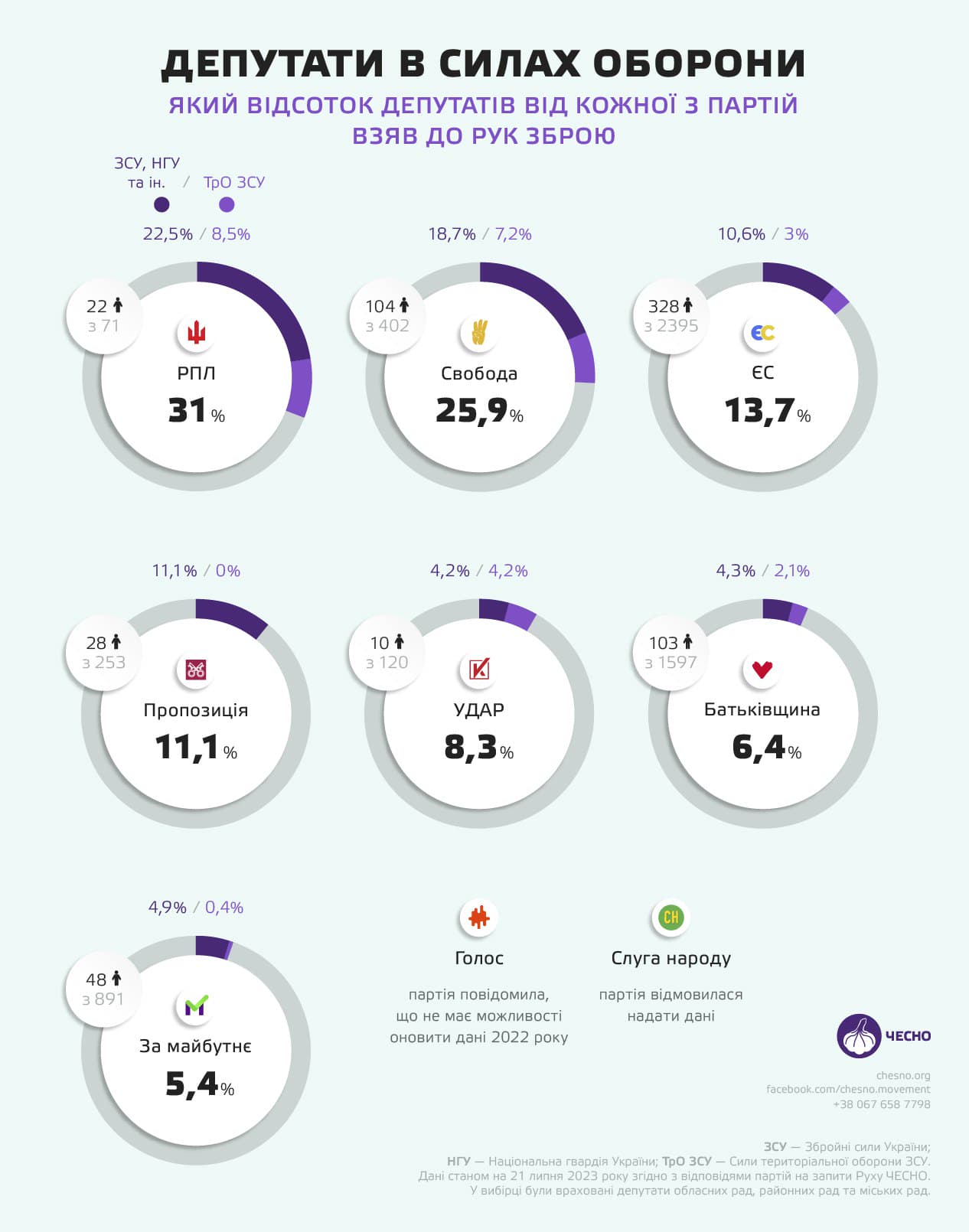 Деталі: Повідомляється, що найбільший відсоток депутатів-фронтовиків на місцевому рівні має "Радикальна партія" (22 військовослужбовці з-поміж 71 депутата, що складає 31% від загальної кількості депутатів рад, які досліджуються), на другому місці "Свобода" (102 із 402 депутатів, які мають мандати у міських, обласних та районних радах, наразі проходять службу − це 25,6%), а на третьому − "Європейська Солідарність" (служать 328, або 13,7% місцевих депутатів рівня міських, обласних і районних рад).