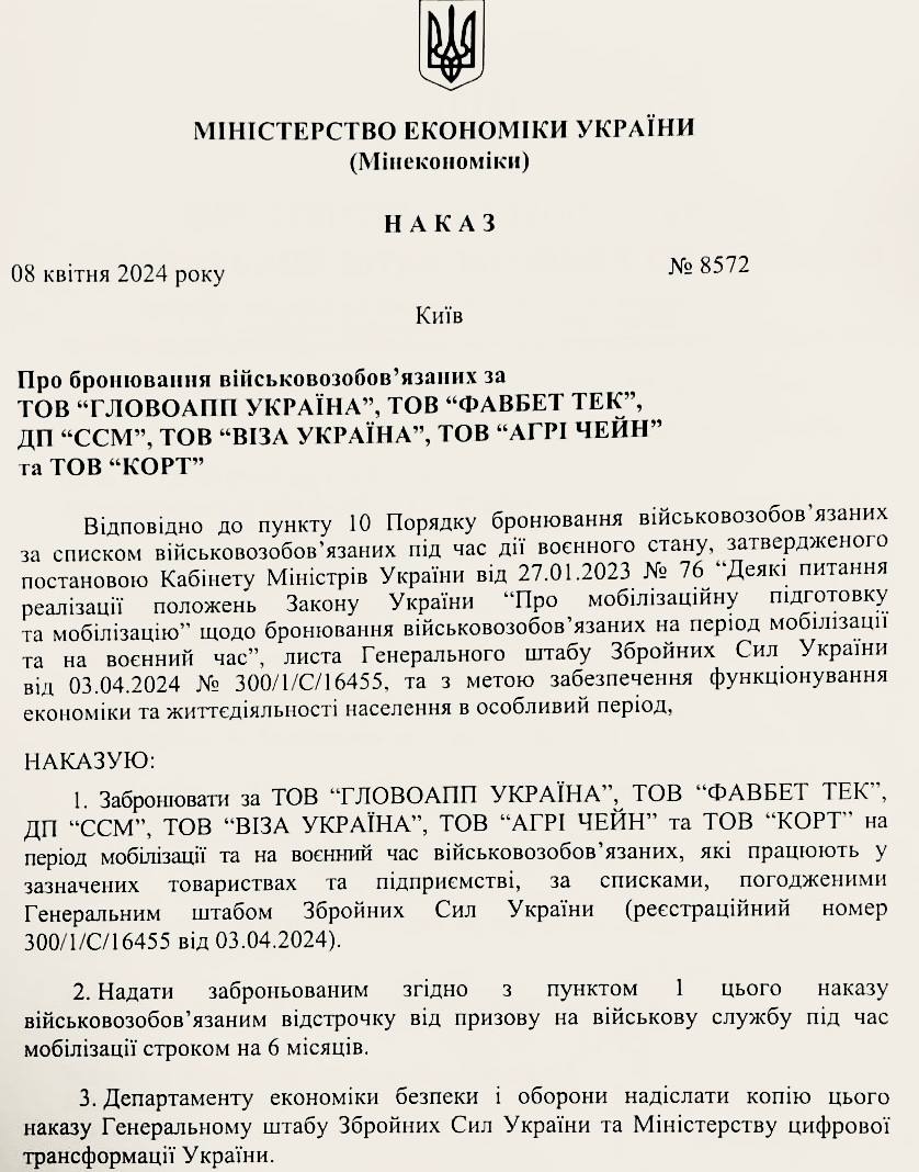 У документі зазначається, що заброньовано працівників ТОВ "ГЛОВОАПП УКРАЇНА", ТОВ "ФАВБЕТ ТЕК", ДП "ССМ", ТОВ "ВІЗА УКРАЇНА", ТОВ "АГРІ ЧЕЙН" та ТОВ "КОРТ". Їм надається відстрочка від призову на військову службу строком на 6 місяців.