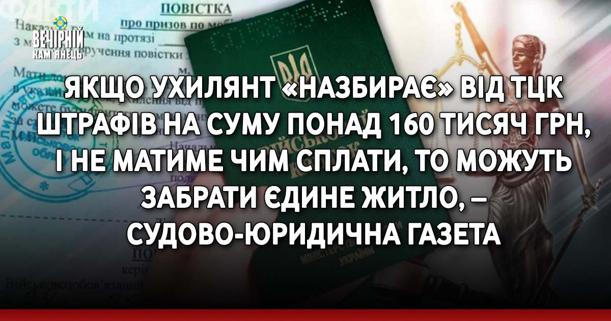 Якщо ухилянт «назбирає» від ТЦК штрафів на суму більше 160 тисяч грн, добровільно їх не сплатить і у нього відсутні кошти на рахунках, авто, то виконавець може звернути стягнення на єдине житло такого боржника.