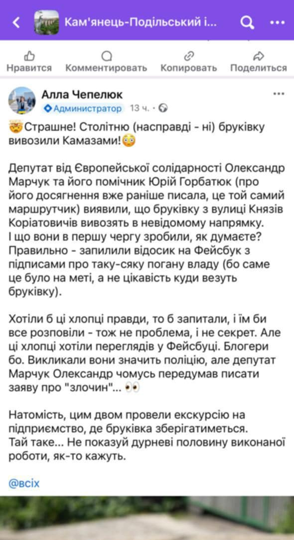 Щойно депутат Олександр Марчук виявив, що бруківку вивозять у невідомому напрямку, як Алла кинулася у бій – не щоб з’ясувати правду, а щоб оперативно запостити дифірамб на честь влади. Логічні запитання? Ні, не чули.