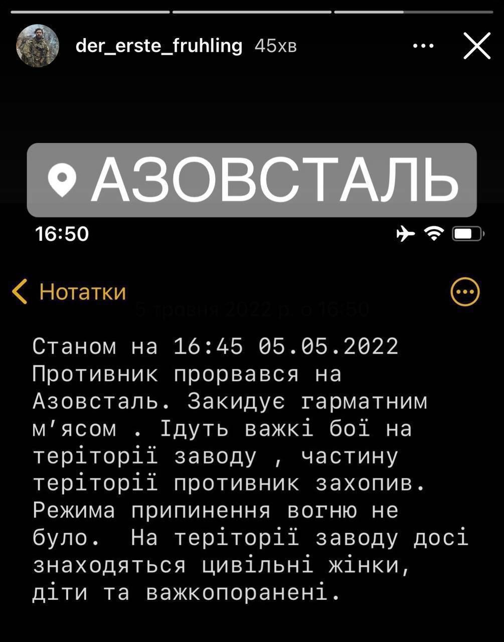 Тим часом один з бійців полку у соціальних мережах повідомив про кровопролитні бої та що на території заводу досі перебувають цивільні люди. Це жінки, діти, а також важкопоранені.