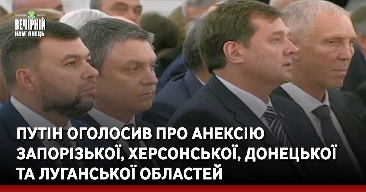 Президент РФ Володимир Путін оголосив незаконну анексію чотирьох областей України: Херсонської, Запорізької, Луганської і Донецької. Жодну з них ворожа армія не контролює повністю. Кремль вважає, що таким чином вони стануть "субʼєктами Російської Федерації".