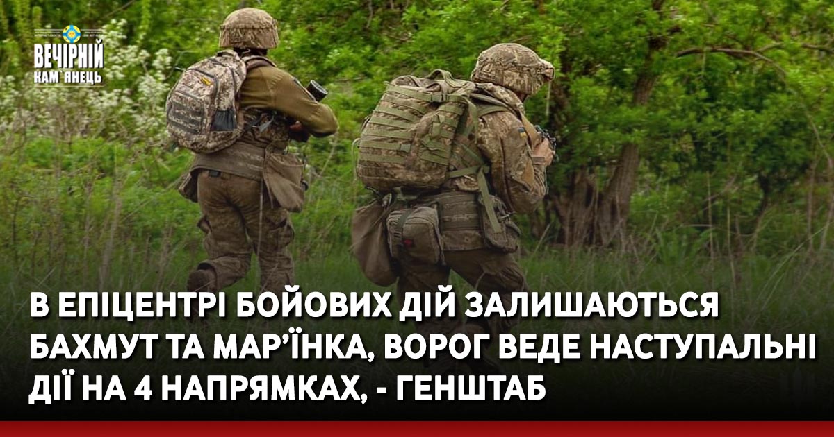 Окупанти продовжують зосереджувати основні зусилля на веденні наступальних дій на Лиманському, Бахмутському, Авдіївському та Мар’їнському напрямках - відбито 41 атаку противника. В епіцентрі бойових дій залишаються Бахмут та Мар’їнка, наші воїни тримають оборону.