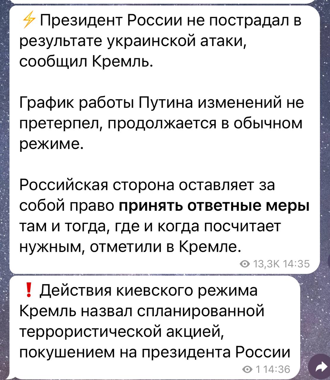 " Два безпілотні літальні апарати були націлені на Кремль. Внаслідок їх падіння та розльоту осколків постраждалих та матеріальних збитків немає, повідомив Кремль", - пишуть пропагандистські росЗМІ.