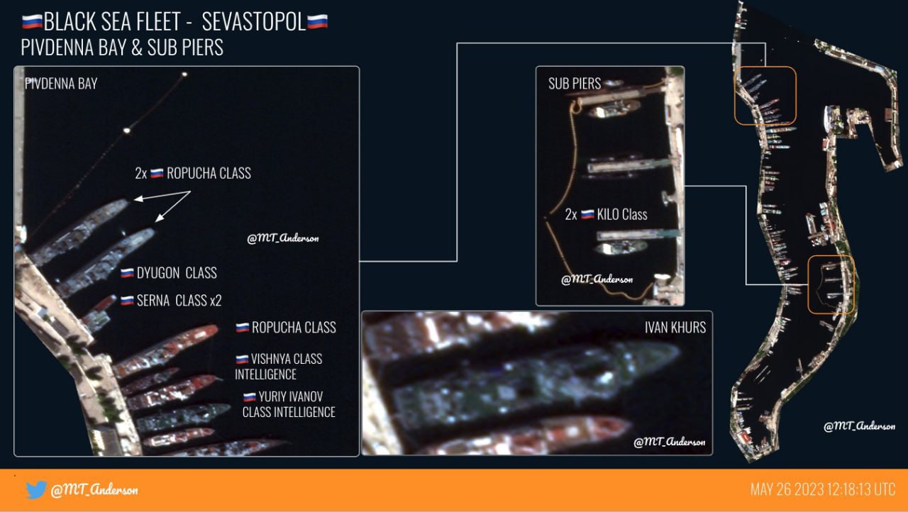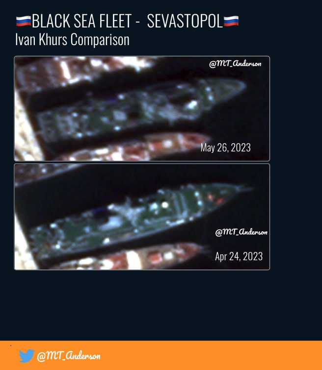 Експерт опублікував нові супутникові знімки бухти окупованого Севастополя. Він порівняв фото за 24 та за 26 травня. Аналітик зауважив, що "Іван Хурс" пошкоджено та завалено на правий борт.